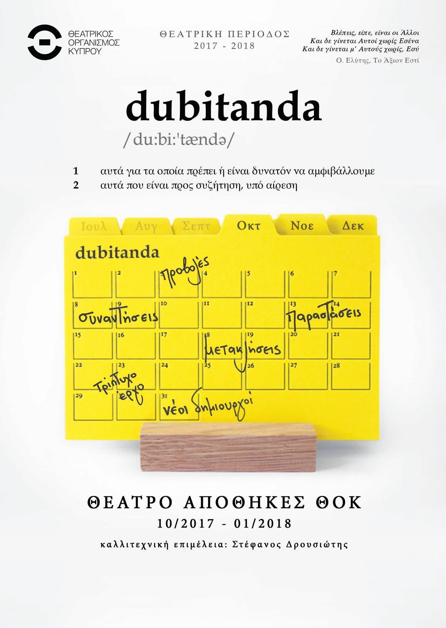 The Dubitanda Festival inaugurated the “Apothikes Theatre Program” of the Cyprus Theatre Organisation. Since 2017, THOC has invited a Cypriot artist to assume the artistic direction of the Apothikes Theatre for a three-month period, designing a series of theatrical events for the local audience. During the first quarter of the 2017–2018 season (October–December), the program was curated by Stefanos Drousiotis.